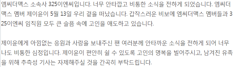 이어 제이윤에게 아낌없는 사랑과 응원을 보내주신 팬 여러분들에께 안타까운 소식을 전하게 되어 너무나도 비통한 심정이라며 제이윤이 편안히 쉴 수 있도록 고인의 명복을 빌어주시고 남겨진 유가족들을 위해서 추측성 기사는 부디 자제해 달라고 간곡히 전했습니다.